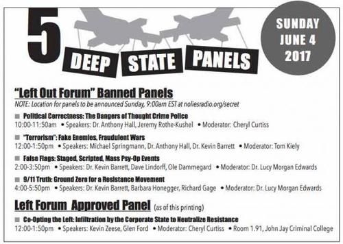 Presentations from the Left-Out Forum panel "False Flags: Staged, Scripted Mass Psy-Op Events" in New York City June 4th, 2017. This panel was one of four that was banned from the Left Forum. Dave Lindorff’s analysis of the Tsarnaev brothers’ backpacks; the pressure cooker “bomb”; the backpacks of Craft International mercenaries at the Boston Marathon; martial law in Boston; GW Bush cheats during the 2004 presidential debate; Ole Dammegard’s “When Terror Struck Norway” analysis of the July 22, 2011 Oslo bombing and mass shooting of teenagers; what doesn’t happen during a false flag event; massive failures of equipment and personnel; failure to respond and stand-down; implosion rather than explosion; multiple shooters; use of crisis actors; crisis-solutions.com; NC-4; Norway’s intent to withdraw from the NATO bombing campaign of Libya; Norway’s support of Palestinians and boycott of Israel; production of media terror events by mobile terror group in order to instill fear and acceptance of a brutal global agenda.
